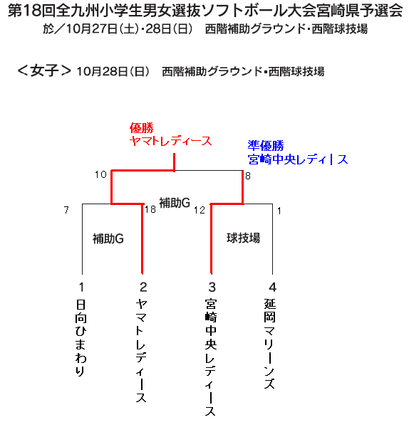 | 宮崎中央レディース | 4 | 2 | 0 | 1 | 0 | 1 | 0 | 8 |