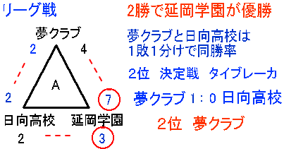 延岡学園高校が2勝で優勝、日向高校、夢クラブ1敗1分けで同勝率となったため、タイブレーカーにて