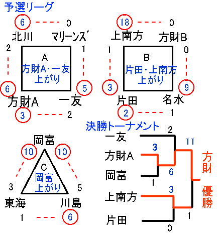 さらに決勝戦では岡富を3:1、一友を6:2、上南方を11:1と勢いに乗って優勝。