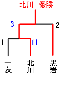 | 北川 | 3 | 2 | 2 | 4 | × | 11 |
