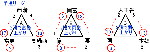 | 岡富中 | 1 | 0 | 4 | 3 | - | - | 8 |