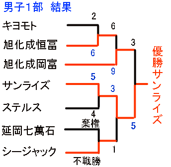 | 旭化成恒冨 | 2 | 1 | 0 | 0 | 3 | × | - | 6 |