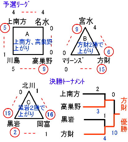 予選リーグを勝ち上がったのは、上南方、高巣野、方財、黒岩の4チーム。