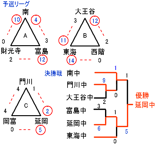 実力伯仲の中、決勝トーナメントに上がったのは南中、延岡中、東海中、大王谷中、門川中、富島中の