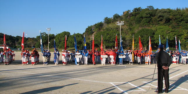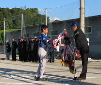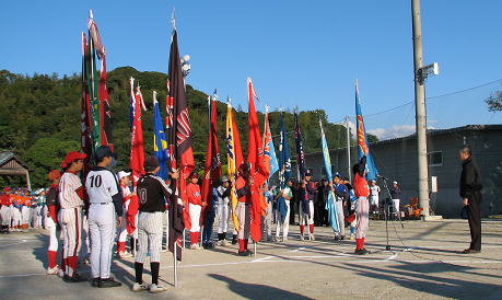 冬の兆しで冷え込む中、早朝7時45分より開会式、昨年優勝のウィングスチームより優勝旗返還