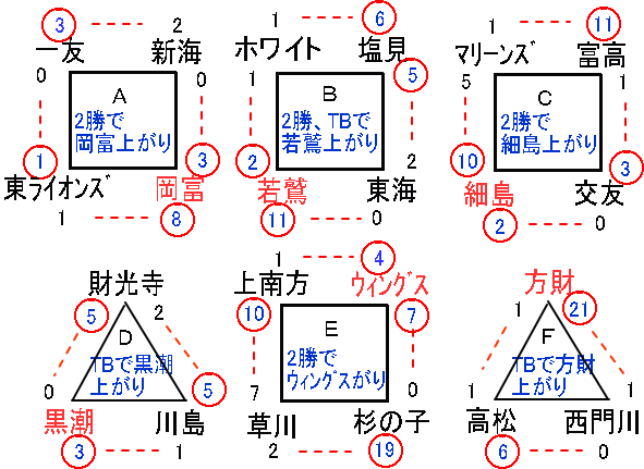 | 高松 | 0 | 1 | 1 | 0 | 4 | 0 | × | 6 |