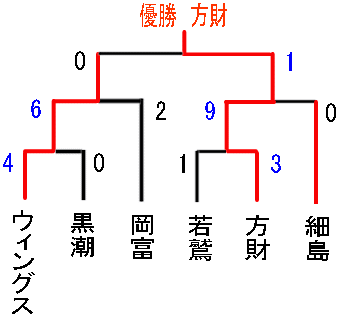 予選リーグを勝ち上がったのは、ウィングス、黒潮、岡富、若鷲、方財、細島、の6チーム。