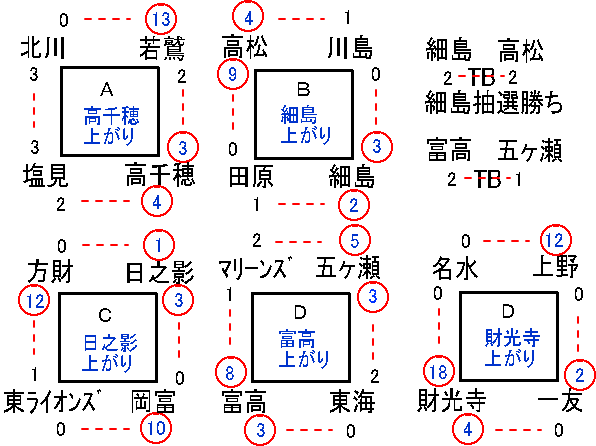 | 東ライオンズ | 0 | 0 | 0 | 0 | 0 | - | - | 0 |