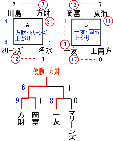| 方財 | 2 | 1 | 3 | 0 | × | - | - | 6 |
