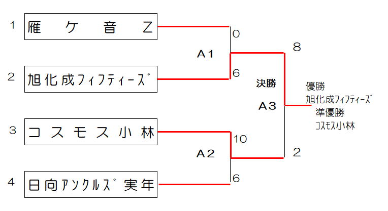 7月11日、北方運動公園にて大会実施しました。 コスモス小林、雁ケ音Z、日向アンクルズ実年、旭化成フィフティーズの4チーム参加。 旭化成フィフティーズが優勝、コスモス小林の2チームが11月の西日本大会(宮崎市)に 出場、健闘を祈ります。