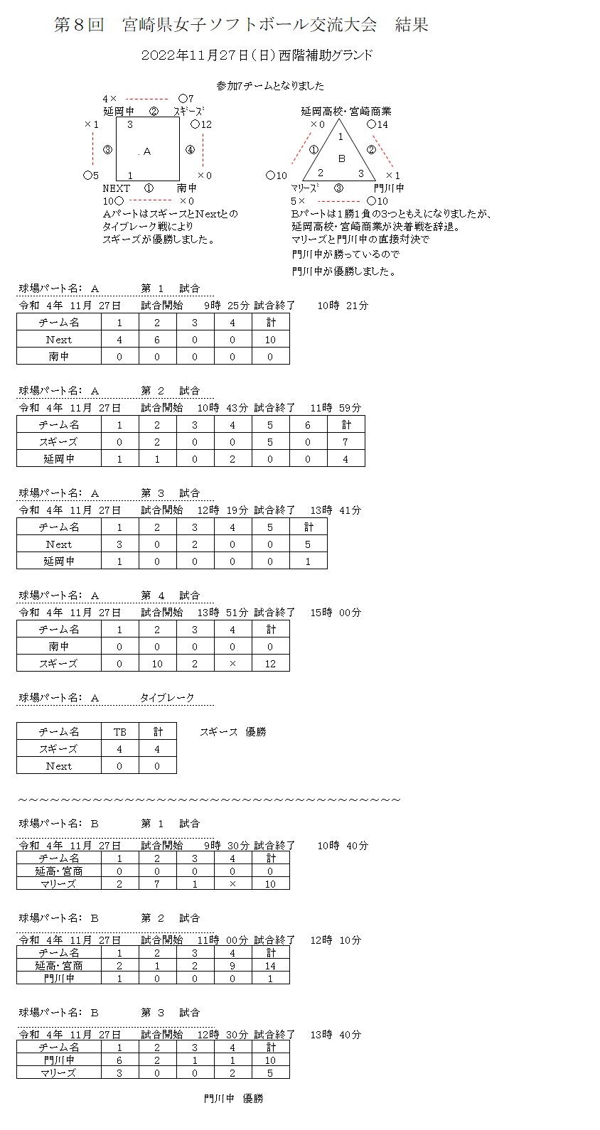 ★第8回 県一般女子ソフトボール交流大会 (11月27日、西階運動公園) 7チーム参加、Aパート4チーム、Bパート3チームで 一日、楽しんで頂きました。 Aパートはスギーズ優勝、Bパートは門川中が優勝 しました。
