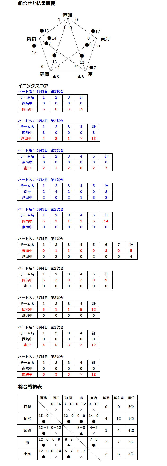 ★第74回延岡地区中学校総合体育大会(夏季) 女子ソフトボール競技 (2023年6月3、4日、西階運動公園) 延岡地区中体連夏季大会、優勝は岡富中学校、2位は南中学校、3位は東海中学校の 結果となりました。 3校は7月8、9日の県大会に出場、健闘を祈ります。