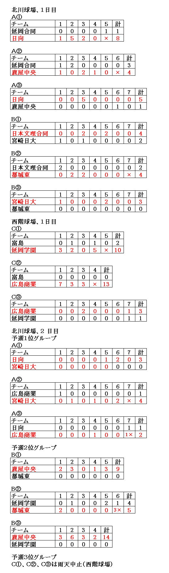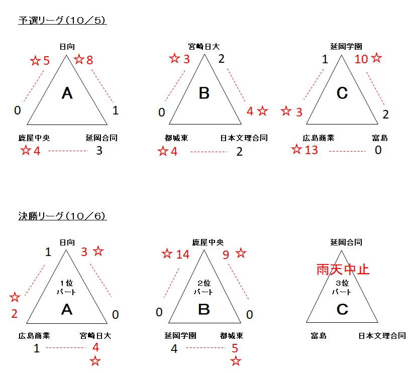 10月5、6日、北川運動公園、西階運動公園にて、両日とも、朝の雨や午前中の雨に 見舞われながらも、2日間の大会ができました。 優勝は日向、準優勝は宮崎日大、3位は広島商業となりました。 関係者の皆さんのご協力に感謝します。全チームの今後の活躍を祈ります。