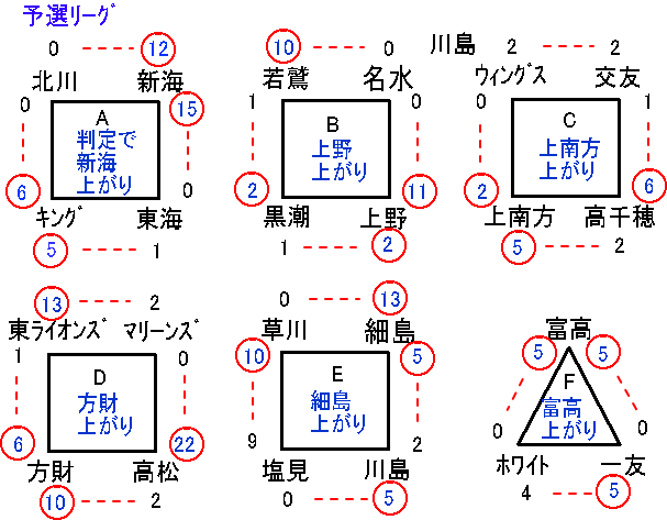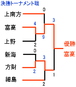 予選リーグを勝ち上がったのは、上南方、富高、上野、新海、方財、細島の6チーム。