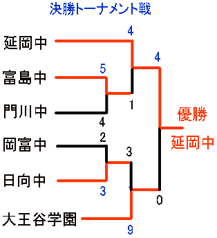 決勝トヘナメントに上がったのは延岡中、富島中、門川中、岡富中、日向中、大王谷学園の6チーム。