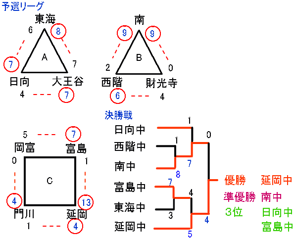 | 東海中 | 3 | 0 | 0 | 3 | 0 | 6 |
