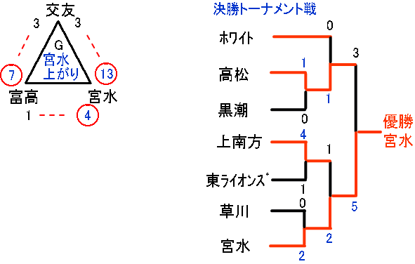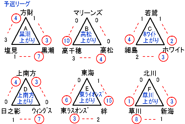 予選リーグを勝ち上がったのは、ホワイト、高松、黒潮、上南方、東ライオンズ、草川、宮水の7チーム。