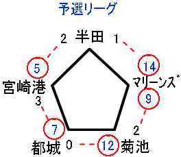 | 宮崎港 | 1 | 3 | 0 | 1 | × | 5 |