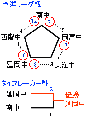 先般の県大会で優勝した南中が予想通り予選2勝としたが、延岡中も2勝、優勝決定戦はタイブーレーカー