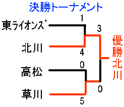 | 東ライオンズ | 1 | 0 | 3 | 0 | × | 4 |