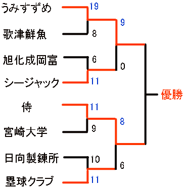 | 塁球クラブ宮崎 | 1 | 0 | 2 | 0 | 0 | 2 | 1× | 6 |