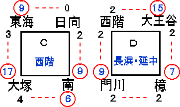 | 東海 | 2 | 3 | 3 | 1 | × | 9 |