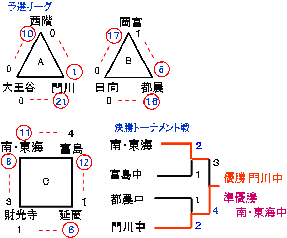 | 南・東海中 | 0 | 0 | 0 | 0 | 1 | 1 | × | 2 |
