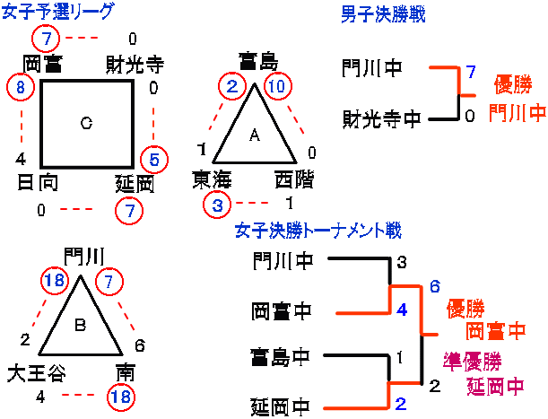 | 門川中 | 3 | 0 | 1 | 3 | 0 | × | 7 |