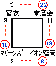 | 南風会 | 5 | 12 | 0 | 2 | 1 | 2 | × | 22 |