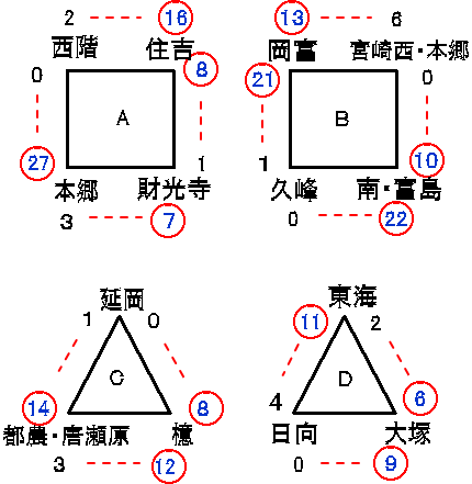 | 宮崎西・本郷 | 1 | 0 | 3 | 2 | 6 |