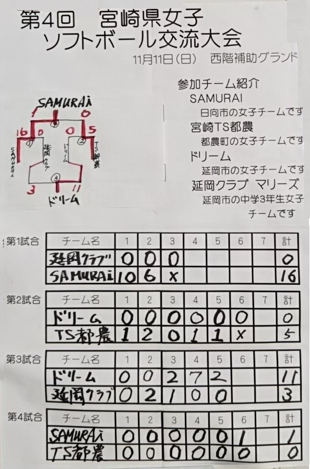 トーナメント方式で試合、SAMURAIが2勝で優勝、宮崎TS都農が準優勝。