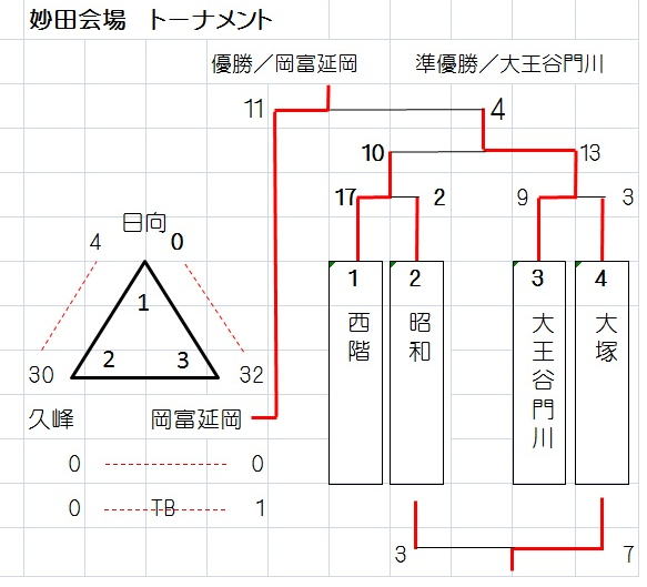 | 大塚中 | 1 | 0 | 5 | 1 | × | 7 |