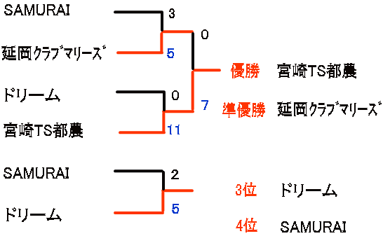 | 宮崎TS都農 | 5 | 2 | 4 | × | 11 |