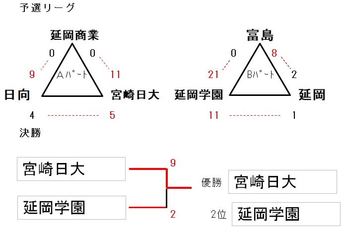 コロナ禍、春季大会ができませんでしたが、10月3日に西階運動公園にて、 秋季大会が高校女子の6チームで実施できました。 (宮崎日大、延岡商業、富島、日向、延岡、延岡学園が参加) 夕刊デイリー新聞社様の後援により、副賞の提供がありました。 夕刊デイリー新聞社様ほか、関係者のご協力に感謝いたします。 決勝戦は、宮崎日大 対 延岡学園となりましたが、宮崎日大の優勝となりました。